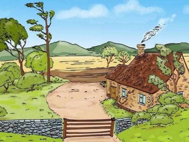 În desen este reprodusă o casă obișnuită de la țară. Pe fundalul ei sunt dealuri și câmpii, iar lângă casă vei observa un gard din pietre, o poartă din lemn și câțiva copaci.