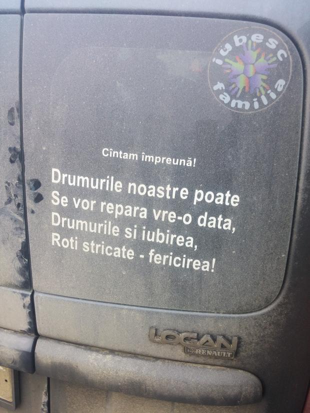 Pe luneta automobilului său, conducătorul a scris câteva versuri modificate din celebrul slagăr "Drumurile noastre", compus de regretatul cântăreţ român de muzică uşoară Dan Spătaru.