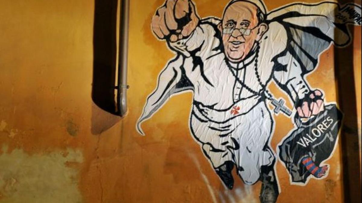 Spre deosebire de eroul cu care e comparat, Papa are în mână o servietă care aproape că dă pe-afară de valori morale.