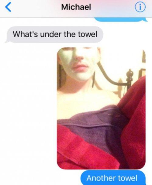 Tanarul a rugat-o apoi sa îi arate ce are sub prosop. Aceasta i-a trimis imediat o alta poza, cu un al doilea prosop pe sub. Jacquie avea de fapt 19 prosoape pe ea. De fiecare data cand a fost rugata sa mai dea un prosop jos, adolescenta s-a supus, pana l-a enervat pe colegul ei si povestea a ajuns virala.