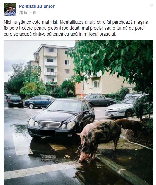 Omul legii, care a publicat instantaneul pe pagina de Facebook "Polițiștii au umor" a făcut următorul comentariu: "Nici nu ştiu ce este mai trist. Mentalitatea unuia care își parchează mașina fix pe o trecere pentru pietoni (pe două, mai precis) sau o turmă de porci care se adapă dintr-o băltoacă cu apă în mijlocul oraşului".