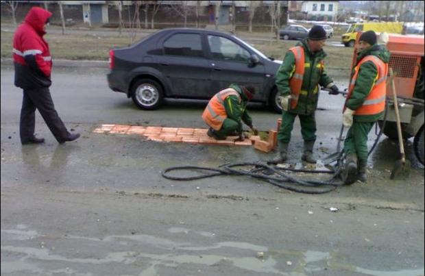 Sătui să tot fie chemaţi să repare craterele din asflat, aceşti muncitori s-au gândit să "plombeze" gropile de pe carosabil cu un material mai trainic, care să reziste un timp mai îndelungat.