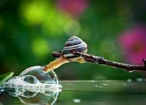 Vyacheslav a surprins acest melc într-o ipostază uimitoare: aflat pe o creangă deasupra unui lac, melcul a străpuns o bulă de apă fără a o sparge: