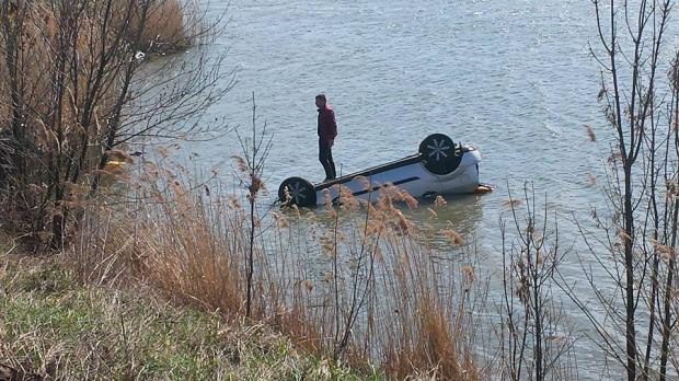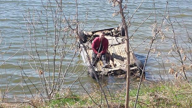 Imagini amuzante surprinse astăzi, în apropiere de Fălticeni, acolo unde un bărbat a plonjat cu mașina într-un iaz.