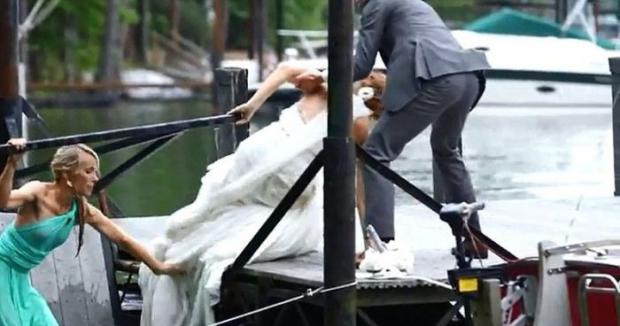 Pasarela din lemn pe care se aflau a cedat sub greutatea lor, şi toţi au căzut în apă. Fotografii, dar şi cameramanul au surprins totul, iar imaginile au fost postate pe internet şi vizionate de zeci de mii de oameni.