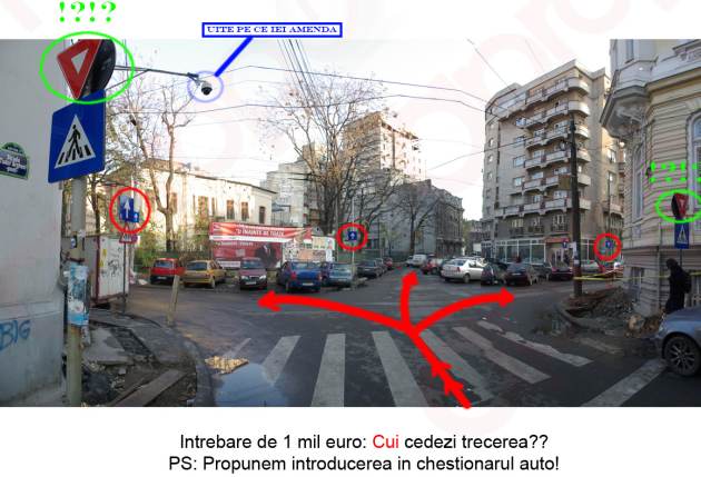 Noile teste de la examenele auto sunt criticate de mulţi viitori şoferi, care le consideră pe alocuri absurde. Probabil însă că Poliţia Română doreşte doar să îi pregătească pe aceştia pentru absurdităţile din trafic. Un exemplu este o intersecţie din Bucureşti, unde şoferii întâlnesc indicatorul ?Cedează trecerea?, deşi şansele ca ei să întâlnească în acea intersecţie o altă maşină sunt inexistente, pentru că restul căilor de acces sunt cu sens unic, în direcţia lor de mers.