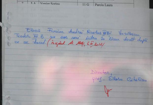 Într-un liceu bucureştean, la avizier a fost pus următorul anunţ: "Elevii Fiucuc Andrei Nicolae XII E şi Vasilescu Teodor XII B nu vor mai intra în liceu decât după ce se tund".