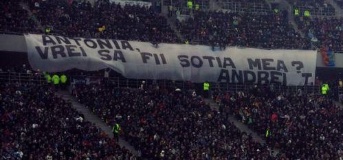 Nefericirea steliştilor nu l-a copleşit însă pe amorez, care şi-a cerut iubita în căsătorie afişând un banner uriaş cu mesajul: " Antonia, vrei să fii soţia mea?", pe sistemul, măcar el să fie fericit...asta dacă EA a acceptat!