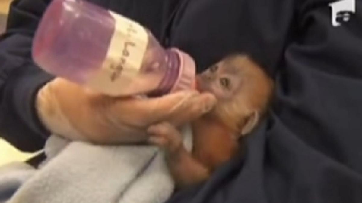 Puiul de animal face parte dintr-o specie rară de maimuţe din Asia, care la naştere sunt portocalii, însă pe măsură ce cresc devin argintii.