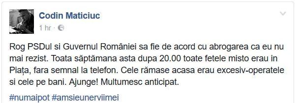 "Rog PSDul si Guvernul României sa fie de acord cu abrogarea ca eu nu mai rezist. Toata săptămana asta dupa 20.00 toate fetele misto erau in Piața, fara semnal la telefon. Cele rămase acasa erau excesiv-operatele si cele pe bani. Ajunge! Multumesc anticipat", a scris Codin Maticiuc, pe Facebook.