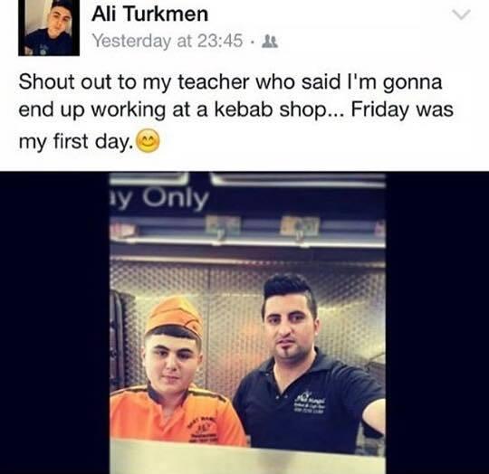 "Un mesaj pentru profesorul meu care mi-a spus că o să ajung să vând kebab... Vineri a fost prima zi", scrie tânărul Ali, în mesajul postat pe Facebook.