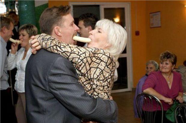 Unul dintre jocuri presupune ca partenerii care au cel puţin 20 de ani de căsătorie să iasă în ring şi să danseze îmbrăţişaţi, ţinând fiecare în gură capătul unei banane.