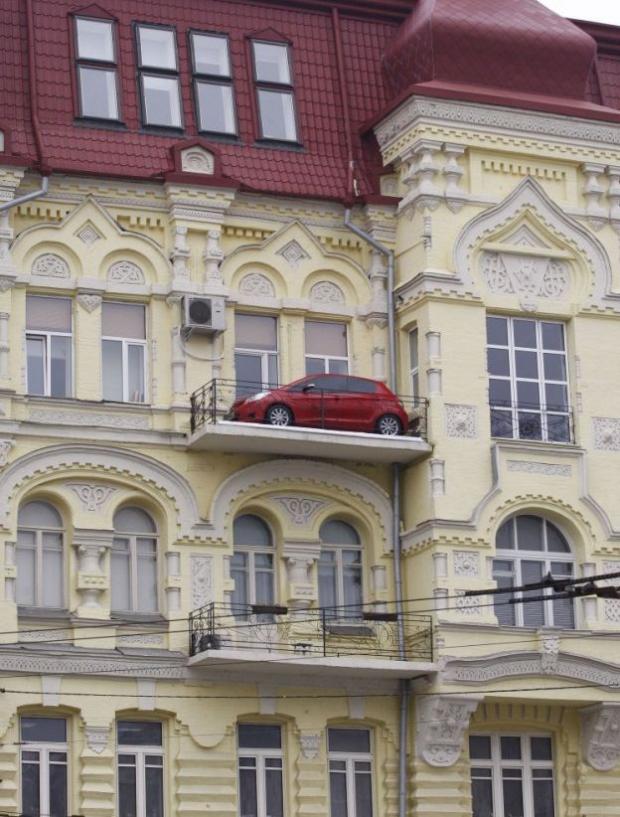O maşină mică şi roşie a fost "parcată" chiar pe balconul unui apartament. Imediat pe internet au început să circule mesaje de genul: "Poate aşa se rezolvă şi problema parcărilor la noi în oraş".