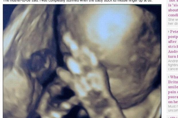 Mămica a povestit jurnaliştilor că medicii încercau să îi mute mâna pentru a-i vedea mai bine faţa, în timpul ecografiei. Vizibil deranjat, fătul le-a arătat degetul mijlociu, apoi şi-a încrucişat mâinile, ca un om supărat.