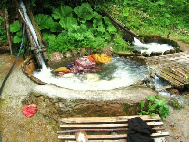 În această fotografie putem vedea cum îşi spală aceşti oameni hainele. Apa de râu este dirijată cu ajutorul unor jgheaburi în niste "mini-piscine" în care se spală hainele, iar datorită presiunii cu care vine apa, nici nu este nevoie de folosirea detergenţilor.