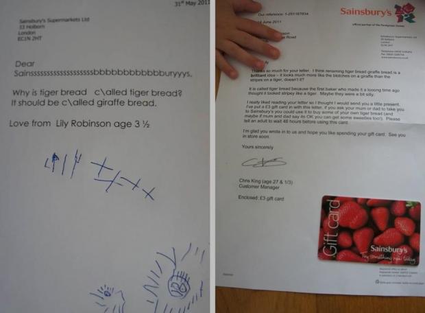 Angajaţii companiei Sainsbury's au considerat că ideea fetiţei a fost „genială”. Nu numai că i-au răspuns la scrisoare într-un mod cât se poate de haios şi i-au trimis un cupon valoric pe care să-l poată cheltui în lanţul de magazine, dar au şi ascultat sugestia fetiţei.