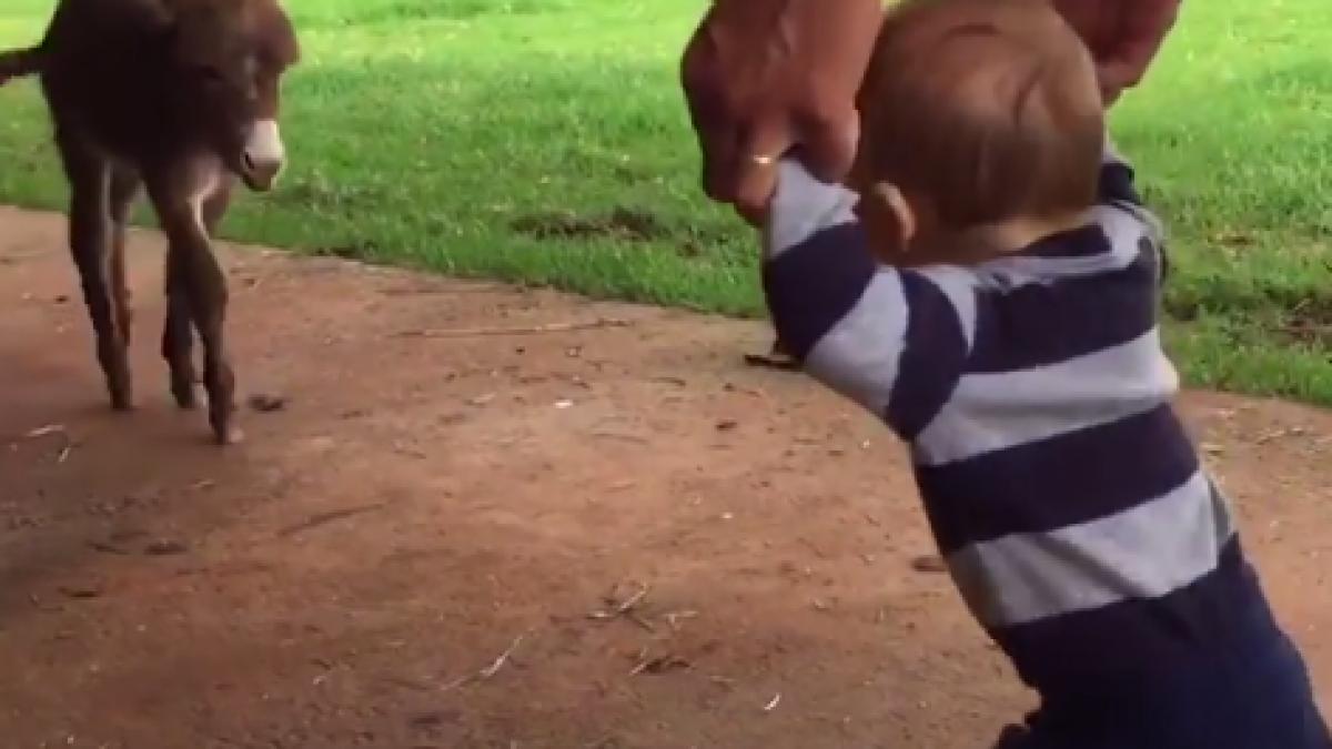 Întâlnire de gradul 3 între un măgăruș și un copil. Ce a urmat demonstrează că, până la urmă, bucuria copilăriei este universală, indiferent de specie.