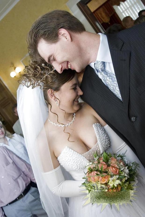 La nunta lor mireasa a fost vedeta, toţi invitaţii se uitau la ea pentru că rochia purtată avea un decolteu adânc cât "Marele Canion", lăsând să se vadă mai mult decât trebuia.