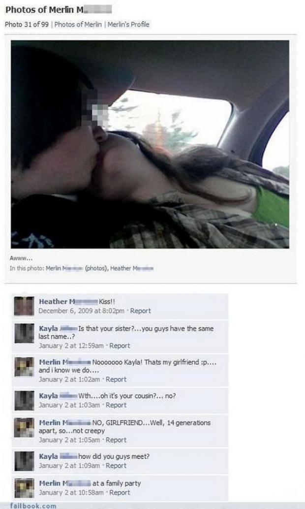 Prietenii lui imediat au sesizat o asemănare foarte ciudată între ei, şi anume: numele lor de familie erau aceleaşi. Acuzat că se sărută chiar cu sora lui, tânărul a recunoscut că fata este de fapt o verişoară îndepărtată, pe care a cunoscut-o la.... o reuniune de familie. :)