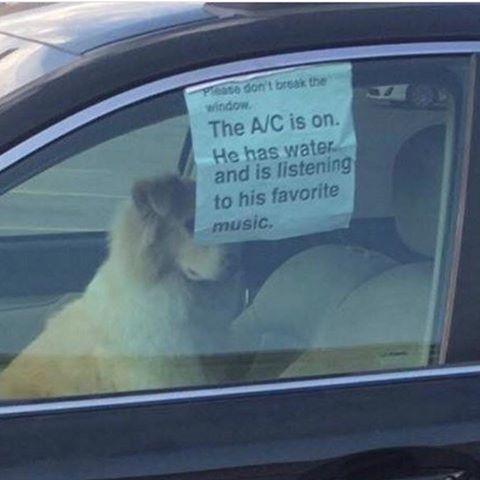 ''Vă rog, nu spargeți geamul. Aerul condiționat este pornit. Are apă și ascultă muzica lui preferată'', a scris stăpânul câinelui.
