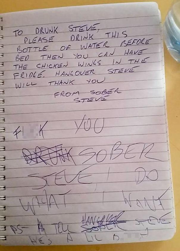Pe rețelele de socializare a devenit viral un bilet lăsat de Steve cel Treaz pentru Steve cel Beat, cu câteva instrucțiuni pentru a evita mahmureala de a doua zi.