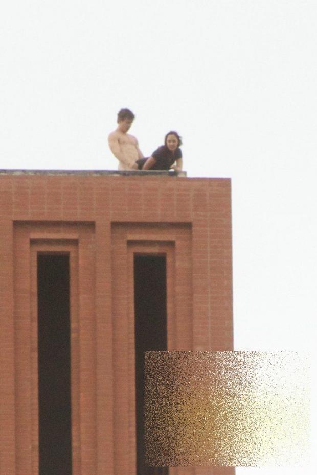Tinerii, nonconformişti şi libertini, s-au gândit să se caţere pe cea mai înaltă clădire din campus şi să dea frâu liber sentimentelor lor. Aşa că s-au pus pe treabă.