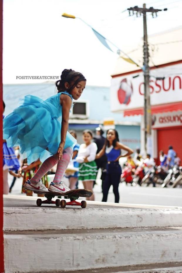 Are şapte ani şi încă se joacă cu păpuşile, dar când se urcă pe placa de skateboard "se rupe" în figuri şi îi lasă pe toţi cu gura căscată.