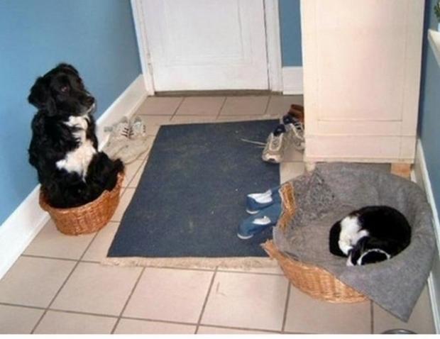 Cam aceasta pare să fie povestea căţelului din imagine. După ce pisica s-a instalat confortabil în coşuleţul lui, câinele a rămas fără prea multe opţiuni...