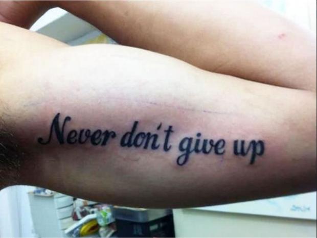 Tipul din poză a reușit. Și nu pentru că a fost inspirat, ci dimpotrivă. În loc de ”never give up” sau ”don't give up" (nu renunța), personajul și-a tatuat ”never don't give up".