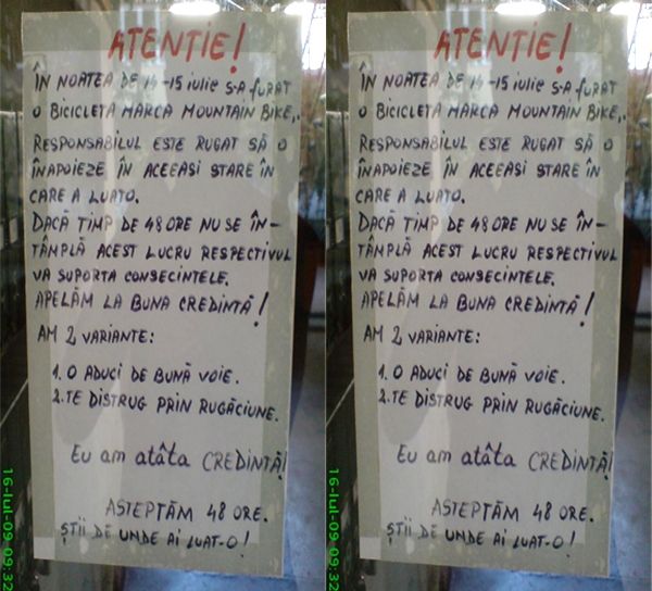 Un astfel de credincios, căruia nişte ?binevoitori? i-au furat o bicicletă, a găsit de cuviinţă să îi înştiinţeze pe aceştia că, dacă nu i-o aduc înapoi, îi va ?distruge prin rugăciune?. Omul, bun creştin, s-a gândit probabil să-şi avertizeze ?aproapele?, înainte de a-l face să plătească.