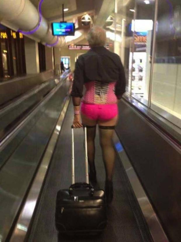 Purtând corset, lenjerie intimă roz și ciorapi de damă, un domn trecut bine de prima tinerețe a reușit să atragă toate privirile celor din aeroport, mai ales prin nonșalanța cu care își purta deocheata ținută.