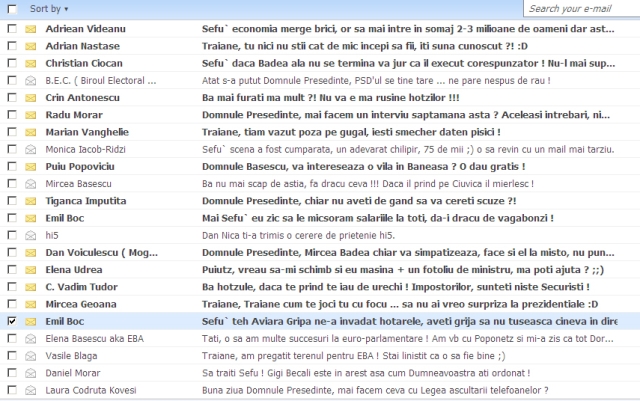 Fotografia care prezintă e-mail-ul virtual al preşedintelui Băsescu a fost prezentată în emisiunea Sinteza Zilei. În poză pot fi observate numele celor care i-ar fi trimis mesaje preşedintelui şi subiectul acestora: