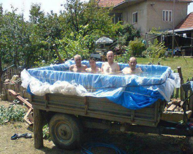 În cazul acestor personaje mioritice, piscină a devenit căruţa pe care o foloseau la treburile gospodăreşti, dar pe care au reuşit să o izoleze suficient de bine pentru a ţine apa în ea.
