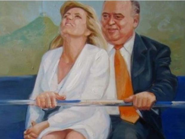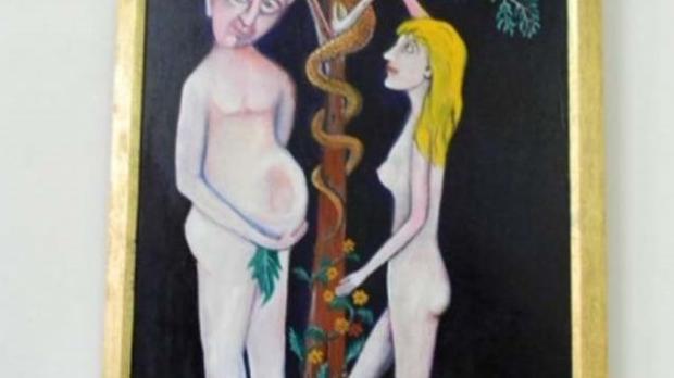 Scandalosul tablou cu numele "Adam şi Eva" îi prezintă pe Traian Băsescu şi Elena Udrea goi puşcă lângă copacul cunoştinţei binelui şi răului din grădina Edenului. Traian Băsescu este reprezentat gravid, iar în rolul şarpelui apare Ion Iliescu, care are pe frunte emblema comunismului, Secera şi ciocanul.