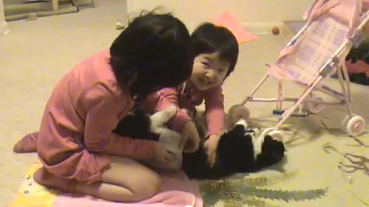 Un altfel de bebeluş: Două fete asiatice pun scutec unei pisici