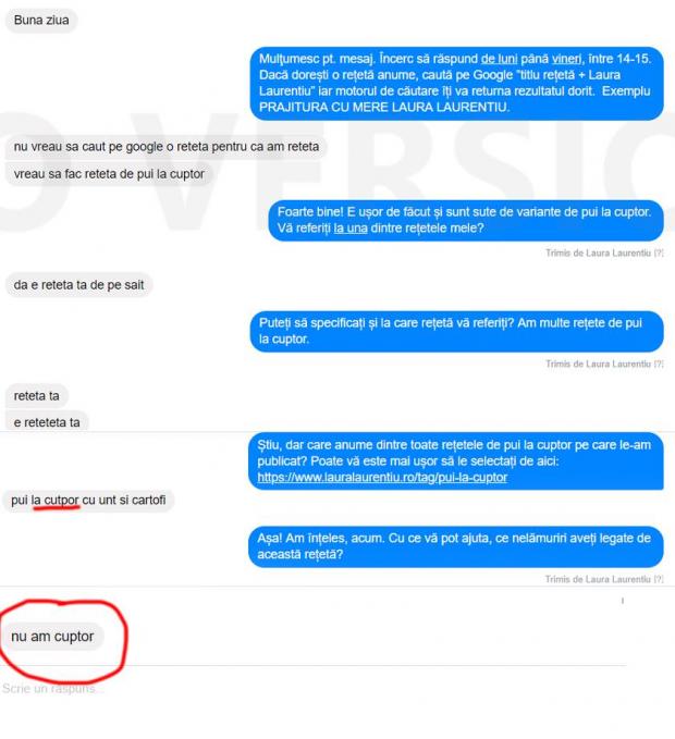 Laura Laurențiu, un cunoscut blogger culinar, a postat pe Facebook schimbul de replici pe care l-a avut cu un internaut.