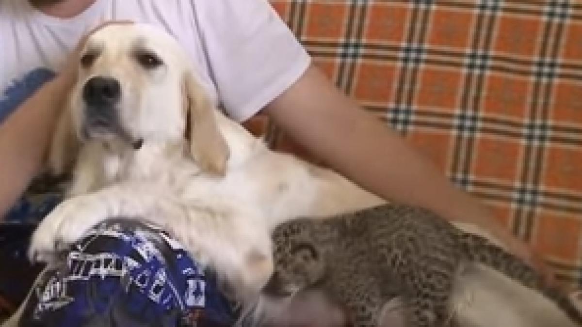 Un pui de o leopard de la o grădină zoologică din Rusia a fost pus în aceeași cușcă cu un câine fiindcă mama acestuia începuse să-și mănânce puii.