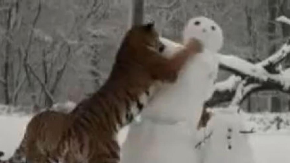 Un videoclip postat pe YouTube arată cum trei tigri au dat târcoale oamenilor de zăpadă, pentru ca apoi să-i doboare.