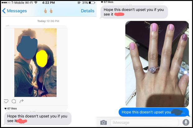 Un barbat a vrut sa se laude la fosta sa iubita cu noua cucerire in speranta ca o va face geloasa si aceasta va regreta ca nu mai formeaza un cuplu. Alaturi de mesajul "sper ca asta sa nu te supere cand o sa vezi", barbatul i-a trimis o poza alaturi de acea femeie, scrie yoda.ro.