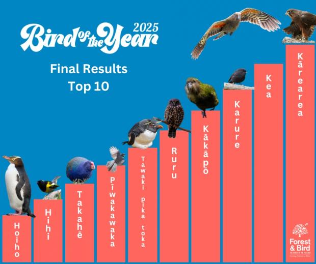 Cele mai multe voturi după șoim au fost obținute de kea (12.506 voturi) și de kakaruia sau black robin (11.726 voturi). Black robin a fost foarte aproape să câștige anul trecut, dar a fost învins de un pinguin timid cu ochi galbeni numit hoiho.
