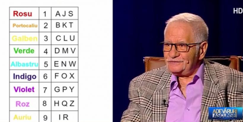 Numerologul Mihai Voropchievici a ținut, sâmbătă, la emisiunea „Adevăruri ascunse”, de la Antena 3, o scurtă lecție de numerologie, explicând cum putem afla culoarea aurei pe care o purtăm, în funcție de numele nostru.