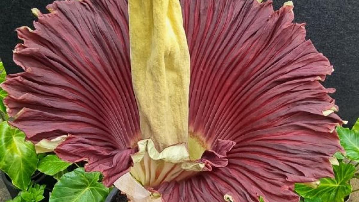 Este vorba despre o floare de Amorphophallus titanum, cunoscută sub numele de "floarea-cadavru", o specie care înfloreşte, de obicei, o dată la şapte până la zece ani. De această dată, însă, a avut nevoie de 15 ani pentru a atinge o înălţime de 135 de centimetri şi pentru a-şi deschide corola, eliberând astfel mirosul fetid caracteristic.