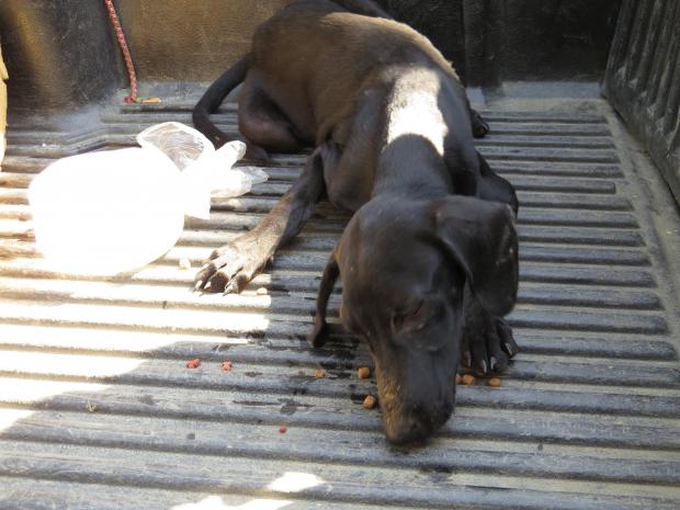 "Când m-am dat jos din mașină pentru a verifica ce se întâmplă cu ea, cățelușa a căzut imediat la pământ și a început să plângă. Era plină de purici și căpușe și foarte deshidratată, dar are cel mai bun suflet...I-am dat apă și puțină mâncare. De abia se putea ridica", a scris Tania.