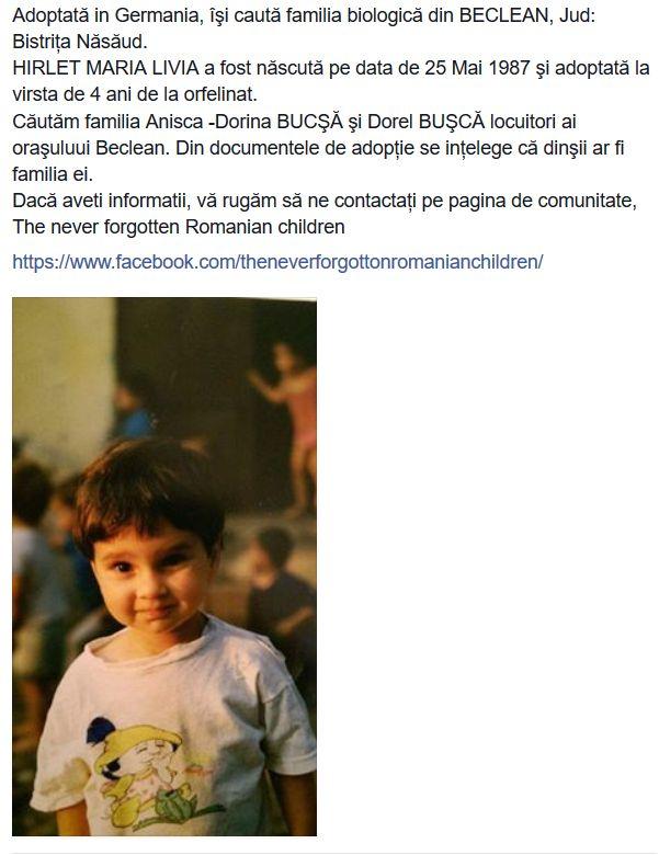 Maria Livia a fost adoptată de o familie din Germania, dar după 25 de ani dorește să-și regăsească familia care a adus-o pe lume. Părinții ei din Beclean ar fi Dorel și Anișca-Dorina Bucșă.