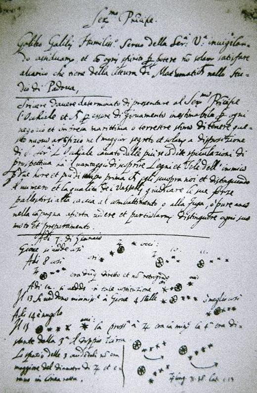 Galileo Galilei se închină cu umilinţă în faţa Măriei Voastre (...) pentru a vă prezenta un telescop ("Occhiale") care va fi de mare folos în misiunile pe mare şi uscat. Vă asigur că voi ţine ascunsă această invenţie şi o voi arăta numai Măriei Voastre.