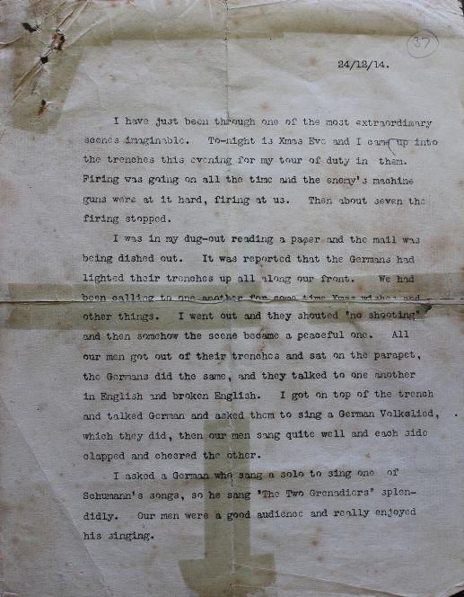 În seara zilei de 24 decembrie, în prima zi a Armistiţiului de Crăciun, căpitanul Jack Armes, din cadrul Primului Batalion al Regimentului Staffordshire, a redactat o scrisoare impresionantă pentru soţia sa în care a povestit momentele trăite în tranşee.