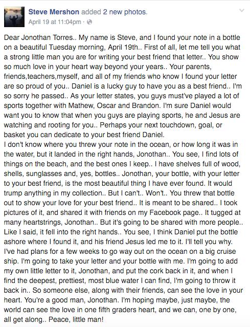 Mesajul fusese redactat de un băiațel de 11 ani pe nume Jonathan și era adresat celui mai bun prieten al acestuia care, potrivit biletului, murise cu puțin timp înainte.