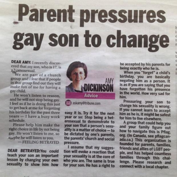 Să încerci să-l constrângi pe fiul tău să-şi schimbe sexualitatea este greşit. Dacă nu îl poţi accepta aşa cum este, cred că ar fi mai bine pentru el să trăiască în altă parte.”