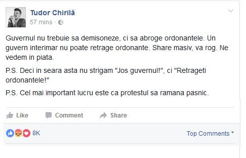 P.S. Cel mai important lucru este ca protestul sa ramana pasnic'', a scris Tudor Chirilă.