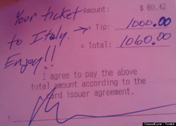 Din explicaţiile date pe Tumblr, ospătăriţa care a primit acest dar neaşteptat, i-a povestit clientului de la masă că are rude în Italia, dar nu şi-a permis niciodată să meargă să le viziteze.